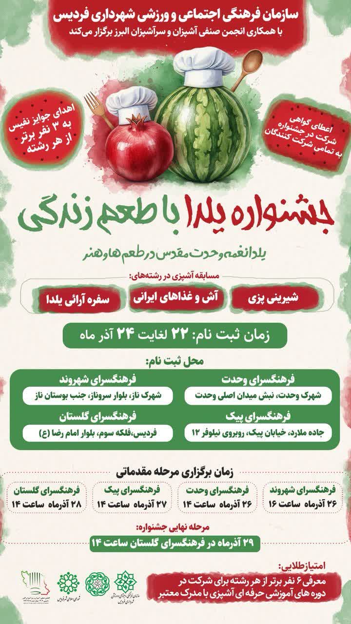 به گزارش پایگاه خبری امید روز به نقل از پایگاه خبری مدیریت شهری فردیس، جشنواره «یلدا با طعم زندگی» توسط سازمان فرهنگی، اجتماعی و ورزشی و با هدف ایجاد فضای شاد، فرهنگی و خانوادگی، و همچنین حمایت از استعدادهای آشپزی فردیس برگزار میشود.