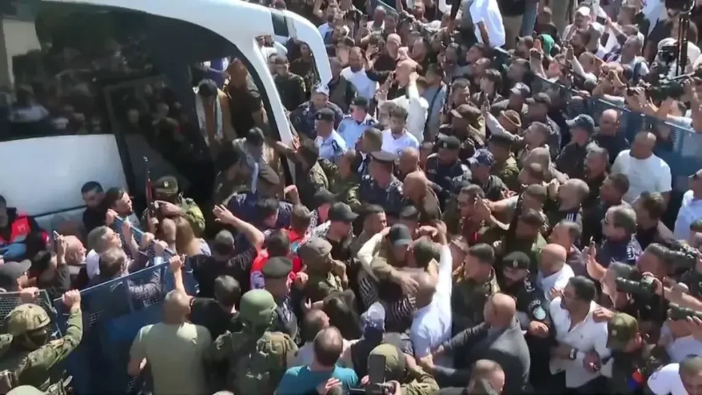ورود اتوبوسهای حامل اسرای آزادهشده فلسطینی به رام الله/ ۱۹۶۶ زندانی فلسطینی در انتظار آزادی
